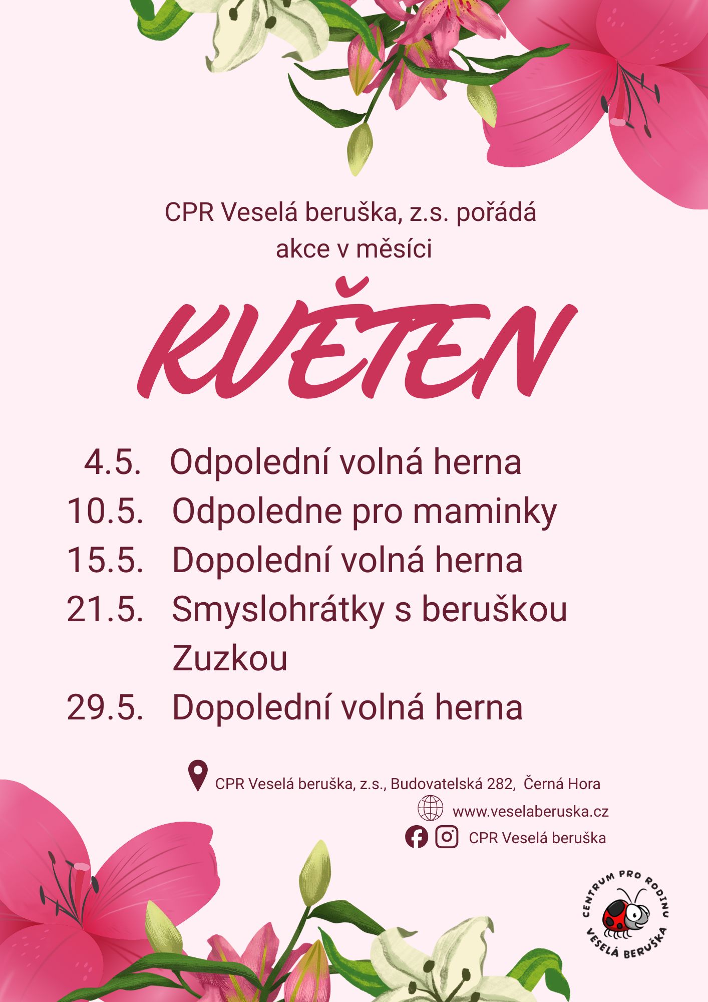 Bohužel v posledních letech dobrovolníků i aktivních rodičů velmi ubývá, proto bychom Vás a Vaše známé, přátele i rodinu chtěli oslovit a požádat o pomoc při organizaci běžného chodu Berušky a také při připravě velkých akcí, které Beruška pořádá. Našim cílem je zajistit chod pro stávající návštěvníky, ale také pro budoucí návštěvníky centra.